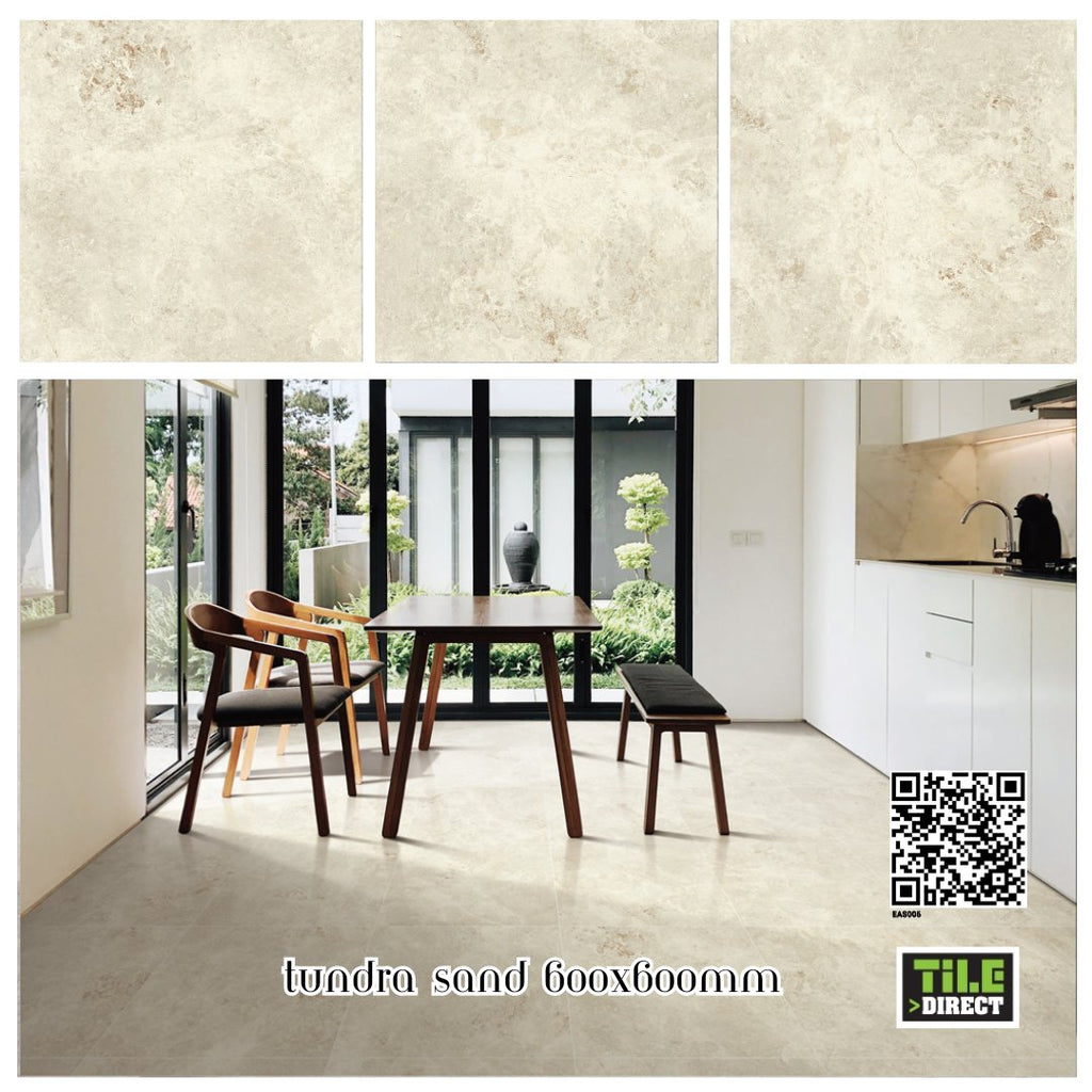 Inspired by the luxurious beauty of marble, Tundra Sand adds a touch of sophistication to any space. With its array of creamy undertones, Tundra Sand will give any space a warm and inviting appearance. Tundra Sand can be used in any area of the home whether it's your kitchen floor or a full wet area bathroom. Ideal for both internal floors and walls. Available in two colours: Ocean 600x600mm and Sand 600x600mm